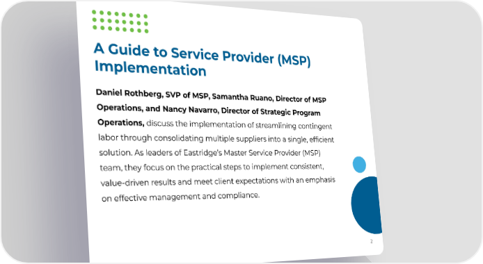 A Guide to Service Provider (MSP) Implementation Daniel Rothberg, SVP of MSP, Samantha Ruano, Director of MSP Operations, and Nancy Navarro, Director of Strategic Program Operations, discuss the implementation of streamlining contingent labor through consolidating multiple suppliers into a single, efficient solution. As leaders of Eastridge’s Master Service Provider (MSP) team, they focus on the practical steps to implement consistent, value-driven results and meet client expectations with an emphasis on effective management and compliance. 2