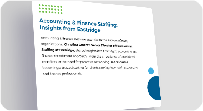 Accounting & Finance Staffing: Insights from Eastridge Accounting & finance roles are essential to the success of many organizations. Christina Grocott, Senior Director of Professional Staffing at Eastridge, shares insights into Eastridge’s accounting and finance recruitment approach. From the importance of specialized recruiters to the need for proactive networking, she discusses becoming a trusted partner for clients seeking top-notch accounting and finance professionals.
