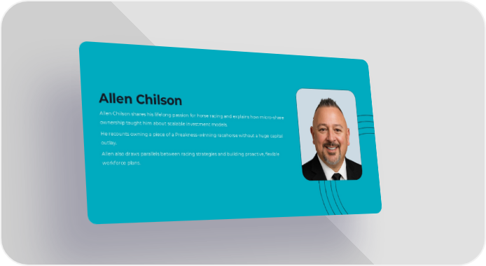 Allen Chilson Allen Chilson shares his lifelong passion for horse racing and explains how micro-share ownership taught him about scalable investment models. He recounts owning a piece of a Preakness-winning racehorse without a huge capital outlay. Allen also draws parallels between racing strategies and building proactive, flexible workforce plans.