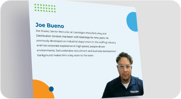 Joe Bueno Joe Bueno, Senior Recruiter at Eastridge's Manufacturing and Distribution Division, has been with Eastridge for nine years. He previously developed an industrial department in the staffing industry and has corporate experience in high-paced, people-driven environments. Joe's extensive recruitment and business development background makes him a key asset to the team.