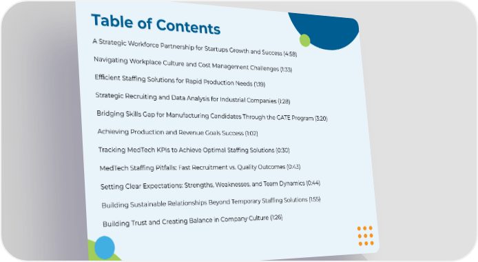 Table of Contents A Strategic Workforce Partnership for Startups Growth and Success (4:58) Navigating Workplace Culture and Cost Management Challenges (1:33) Efficient Staffing Solutions for Rapid Production Needs (1:19) Strategic Recruiting and Data Analysis for Industrial Companies (1:28) Bridging Skills Gap for Manufacturing Candidates Through the GATE Program (3:20) Achieving Production and Revenue Goals Success (1:02) Tracking MedTech KPIs to Achieve Optimal Staffing Solutions (0:30) MedTech Staffing Pitfalls: Fast Recruitment vs. Quality Outcomes (0:43) Setting Clear Expectations: Strengths, Weaknesses, and Team Dynamics (0:44) Building Sustainable Relationships Beyond Temporary Staffing Solutions (1:55) Building Trust and Creating Balance in Company Culture (1:26)