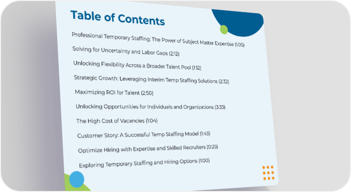 Table of Contents Professional Temporary Staffing: The Power of Subject Matter Expertise (1:05) Solving for Uncertainty and Labor Gaps (2:12) Unlocking Flexibility Across a Broader Talent Pool (1:12) Strategic Growth: Leveraging Interim Temp Staffing Solutions (2:32) Maximizing ROI for Talent (2:50) Unlocking Opportunities for Individuals and Organizations (3:33) The High Cost of Vacancies (1:04) Customer Story: A Successful Temp Staffing Model (1:43) Optimize Hiring with Expertise and Skilled Recruiters (0:25) Exploring Temporary Staffing and Hiring Options (1:00)