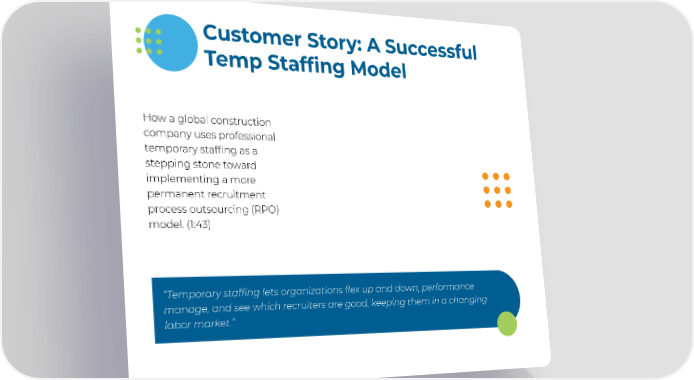 Customer Story: A Successful Temp Staffing Model How a global construction company uses professional temporary staffing as a stepping stone toward implementing a more permanent recruitment process outsourcing (RPO) model. (1:43) “Temporary staffing lets organizations flex up and down, performance manage, and see which recruiters are good, keeping them in a changing labor market.”
