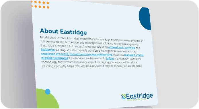 About Eastridge Established in 1972, Eastridge Workforce Solutions is an employee-owned provider of full-service talent acquisition and management solutions for companies globally. Eastridge provides a full range of solutions including professional / technical and industrial staffing. We also provide workforce management solutions such as employer of record, recruitment process outsourcing, as well as managed service provider programs. Our services are backed with Talient, a proprietary workforce technology that streamlines every step of managing your extended workforce. Eastridge proudly helps over 20,000 associates find jobs annually across the globe.