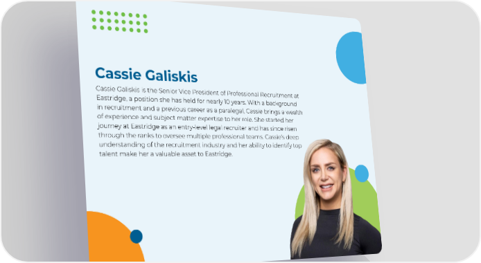 Cassie Galiskis Cassie Galiskis is the Senior Vice President of Professional Recruitment at Eastridge, a position she has held for nearly 10 years. With a background in recruitment and a previous career as a paralegal, Cassie brings a wealth of experience and subject matter expertise to her role. She started her journey at Eastridge as an entry-level legal recruiter and has since risen through the ranks to oversee multiple professional teams. Cassie’s deep understanding of the recruitment industry and her ability to identify top talent make her a valuable asset to Eastridge.