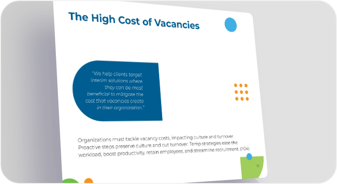 The High Cost of Vacancies “We help clients target interim solutions where they can be most beneficial to mitigate the cost that vacancies create in their organization.” Organizations must tackle vacancy costs, impacting culture and turnover. Proactive steps preserve culture and cut turnover. Temp strategies ease the workload, boost productivity, retain employees, and streamline recruitment. (1:04) 10