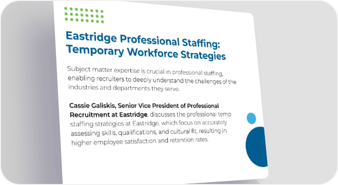 Eastridge Professional Staffing: Temporary Workforce Strategies Subject matter expertise is crucial in professional staffing, enabling recruiters to deeply understand the challenges of the industries and departments they serve. Cassie Galiskis, Senior Vice President of Professional Recruitment at Eastridge, discusses the professional temp staffing strategies at Eastridge, which focus on accurately assessing skills, qualifications, and cultural fit, resulting in higher employee satisfaction and retention rates.