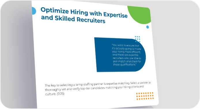 12 Optimize Hiring with Expertise and Skilled Recruiters “You want to ensure that it’s actually going to make your hiring more efficient, and there are expertise recruiters who are able to skill-match and check for those qualifications.” The key to selecting a temp staffing partner is expertise matching. Select a partner to thoroughly vet and verify top-tier candidates matching your hiring criteria and culture. (0:25)