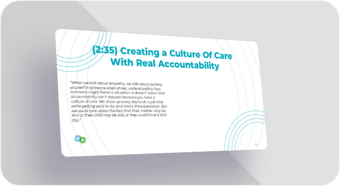 14 (2:35) Creating a Culture Of Care With Real Accountability “When we talk about empathy, we talk about putting yourself in someone else's shoes, understanding how someone might feel in a situation. It doesn't mean that accountability can't happen because you have a culture of care. We show up every day to do a job that we're getting paid to do, and that's the expectation. But we could care about the fact that their mother may be sick or their child may be sick, or they could have a bad day.”