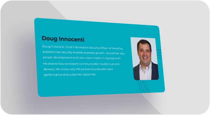 Doug Innocenti Doug Innocenti, Chief Information Security Officer at MoonPay, explains how security enables business growth. He outlines why people development and clear vision matter in hypergrowth. He shares how consistent communication builds trust and delivery. He shows why HR partnership elevates team performance and customer outcomes.