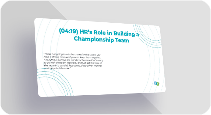 (04:19) HR’s Role in Building a Championship Team “You're not going to win the championship unless you have a strong team and you can keep them together. Anonymous surveys are wonderful because that's a way to go with the team mentality and just get the voice of the team in a candid, fact-based, data-driven manner, and helps build a case.”
