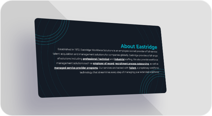 About Eastridge Established in 1972, Eastridge Workforce Solutions is an employee-owned provider of full-service talent acquisition and management solutions for companies globally. Eastridge provides a full range of solutions including professional / technical and industrial staffing. We also provide workforce management solutions such as employer of record, recruitment process outsourcing, as well as managed service provider programs. Our services are backed with Talient, a proprietary workforce technology that streamlines every step of managing your extended workforce.