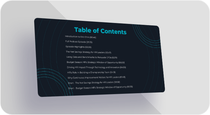 Introduction to Eric Chin (00:46) Full Podcast Episode (29:35) Episode Highlights (02:20) The Net Savings Strategy for HR Leaders (05:47) Using Data and Benchmarks to Persuade CFOs (02:19) Budget Season: HR’s Strategic Window of Opportunity (06:00) Driving HR Impact Through Technology and Innovation (04:50) HR’s Role in Building a Championship Team (04:19) Why Continuous Improvement Matters for HR Leaders (01:48) Short - The Net Savings Strategy for HR Leaders (00:58) Short - Budget Season: HR’s Strategic Window of Opportunity (00:58) Table of Contents