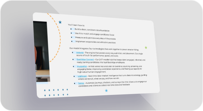 You’ll learn how to: ● Build a clean, consistent data foundation ● Use AI to match and engage candidates faster ● Measure and optimize every step of the process ● Implement responsible and ethical AI practices Our model integrates four technologies that work together to power smarter hiring: ● Avionté - The engine that powers every req, submittal, and placement. Our single source of truth for performance, speed, and scale. ● Eastridge Connect - Our 24/7 mobile hub that keeps talent engaged, informed, and ready, turning candidates into loyal Eastridge employees. ● Purplefish - AI that works like a recruiter on overdrive, sourcing, screening, and engaging faster, improving candidates' experience, and freeing up capacity for high-value human engagement. ● Lightcast - Real-time labor market intelligence that turns data into strategy, guiding where we recruit, what we pay, and how we win. ● Sense - Automate journeys, chatbots, and surveys that that allows us to engage our candidates and clients to collect real time data and feedback