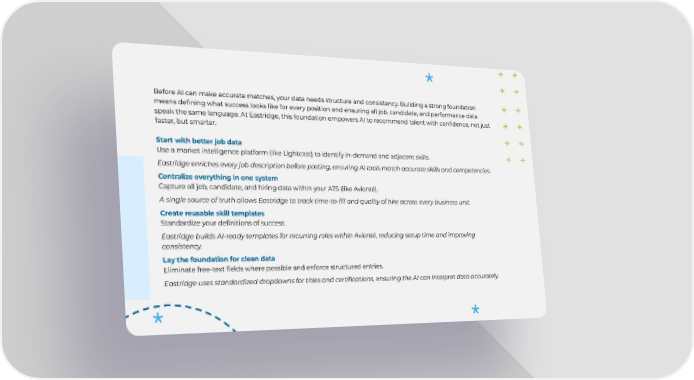 Before AI can make accurate matches, your data needs structure and consistency. Building a strong foundation means defining what success looks like for every position and ensuring all job, candidate, and performance data speak the same language. At Eastridge, this foundation empowers AI to recommend talent with confidence, not just faster, but smarter. Start with better job data Use a market intelligence platform (like Lightcast) to identify in-demand and adjacent skills. Eastridge enriches every job description before posting, ensuring AI tools match accurate skills and competencies. Centralize everything in one system Capture all job, candidate, and hiring data within your ATS (like Avionté). A single source of truth allows Eastridge to track time-to-fill and quality of hire across every business unit. Create reusable skill templates Standardize your definitions of success. Eastridge builds AI-ready templates for recurring roles within Avionté, reducing setup time and improving consistency. Lay the foundation for clean data Eliminate free-text fields where possible and enforce structured entries. Eastridge uses standardized dropdowns for titles and certifications, ensuring the AI can interpret data accurately.