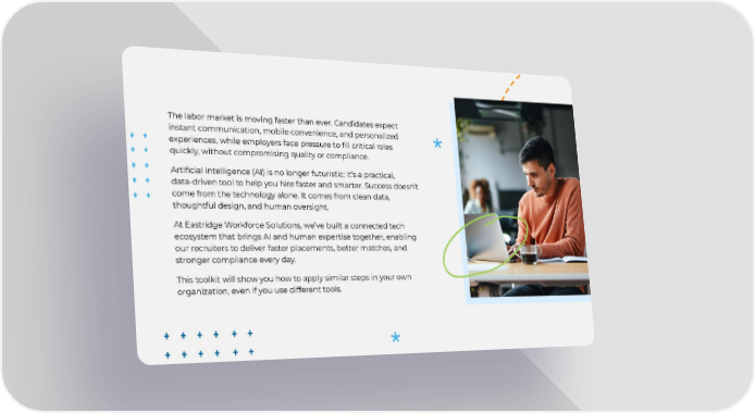 The labor market is moving faster than ever. Candidates expect instant communication, mobile convenience, and personalized experiences, while employers face pressure to fill critical roles quickly, without compromising quality or compliance. Artificial intelligence (AI) is no longer futuristic; it’s a practical, data-driven tool to help you hire faster and smarter. Success doesn’t come from the technology alone. It comes from clean data, thoughtful design, and human oversight. At Eastridge Workforce Solutions, we’ve built a connected tech ecosystem that brings AI and human expertise together, enabling our recruiters to deliver faster placements, better matches, and stronger compliance every day. This toolkit will show you how to apply similar steps in your own organization, even if you use different tools.