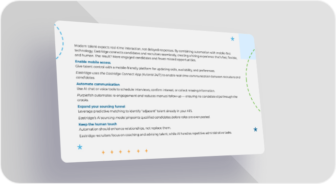 Modern talent expects real-time interaction, not delayed responses. By combining automation with mobile-first technology, Eastridge connects candidates and recruiters seamlessly, creating a hiring experience that’s fast, flexible, and human. The result? More engaged candidates and fewer missed opportunities. Enable mobile access Give talent control with a mobile-friendly platform for updating skills, availability, and preferences. Eastridge uses the Eastridge Connect App (Avionté 24/7) to enable real-time communication between recruiters and candidates. Automate communication Use AI chat or voice tools to schedule interviews, confirm interest, or collect missing information. Purplefish automates re-engagement and reduces manual follow-up — ensuring no candidate slips through the cracks. Expand your sourcing funnel Leverage predictive matching to identify “adjacent” talent already in your ATS. Eastridge’s AI sourcing model pinpoints qualified candidates before roles are even posted. Keep the human touch Automation should enhance relationships, not replace them. Eastridge recruiters focus on coaching and advising talent, while AI handles repetitive administrative tasks.