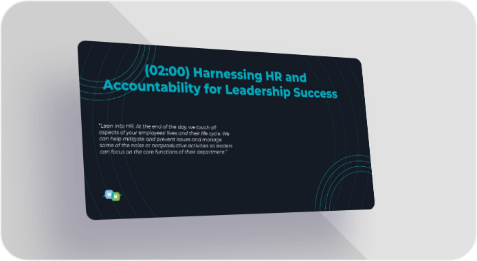 (02:00) Harnessing HR and Accountability for Leadership Success “Lean into HR. At the end of the day, we touch all aspects of your employees' lives and their life cycle. We can help mitigate and prevent issues and manage some of the noise or nonproductive activities so leaders can focus on the core functions of their department.”