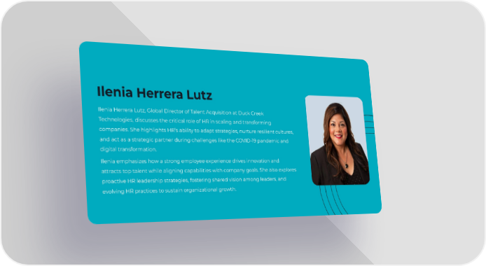 Ilenia Herrera Lutz Ilenia Herrera Lutz, Global Director of Talent Acquisition at Duck Creek Technologies, discusses the critical role of HR in scaling and transforming companies. She highlights HR’s ability to adapt strategies, nurture resilient cultures, and act as a strategic partner during challenges like the COVID-19 pandemic and digital transformation. Ilenia emphasizes how a strong employee experience drives innovation and attracts top talent while aligning capabilities with company goals. She also explores proactive HR leadership strategies, fostering shared vision among leaders, and evolving HR practices to sustain organizational growth.