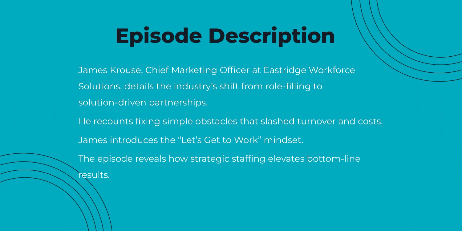 James Krouse, Chief Marketing Officer at Eastridge Workforce Solutions, details the industry’s shift from role-filling to solution-driven partnerships. He recounts fixing simple obstacles that slashed turnover and costs. James introduces the “Let’s Get to Work” mindset. The episode reveals how strategic staffing elevates bottom-line results. Episode Description