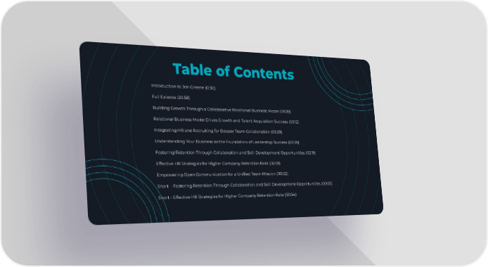 Table of Contents Introduction to Jon Greene (0:30) Full Episode (20:58) Building Growth Through a Collaborative Relational Business Model (01:09) Relational Business Model Drives Growth and Talent Acquisition Success (03:12) Integrating HR and Recruiting for Deeper Team Collaboration (03:29) Understanding Your Business as the Foundation of Leadership Success (03:39) Fostering Retention Through Collaboration and Skill Development Opportunities (03:19) Effective HR Strategies for Higher Company Retention Rate (02:01) Empowering Open Communication for a Uniļ¬ed Team Mission (00:52) Short - Fostering Retention Through Collaboration and Skill Development Opportunities (00:53) Short - Effective HR Strategies for Higher Company Retention Rate (00:54)