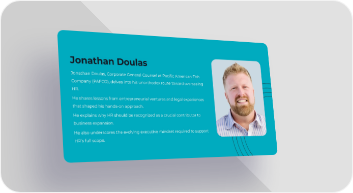 Jonathan Doulas Jonathan Doulas, Corporate General Counsel at Pacific American Fish Company (PAFCO), delves into his unorthodox route toward overseeing HR. He shares lessons from entrepreneurial ventures and legal experiences that shaped his hands-on approach. He explains why HR should be recognized as a crucial contributor to business expansion. He also underscores the evolving executive mindset required to support HR’s full scope.