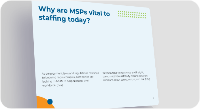 Why are MSPs vital to staffing today? As employment laws and regulations continue Without data transparency and insight, to become more complex, companies are companies have difficulty making strategic looking to MSPs to help manage their decisions about spend, output, and risk. (1:47) workforce. (1:24) 66