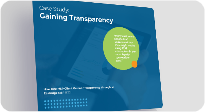 Case Study: Gaining Transparency “Many customers simply don’t understand that they might not be using 1099 contractors in the most legally appropriate way.” How One MSP Client Gained Transparency through an Eastridge MSP (1:20) 14