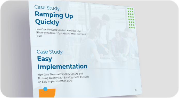 Case Study: Ramping Up Quickly How One Medtech Leader Leverages MSP Efficiency to Ramp Quickly and Meet Demand (2:40) Case Study: Easy Implementation How One Pharma Company Got Up and Running Quickly with Eastridge MSP Through an Easy Implementation (1:06) 15