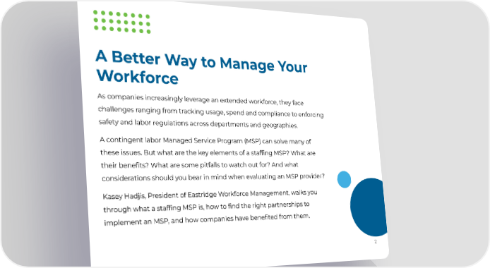 A Better Way to Manage Your Workforce As companies increasingly leverage an extended workforce, they face challenges ranging from tracking usage, spend and compliance to enforcing safety and labor regulations across departments and geographies. A contingent labor Managed Service Program (MSP) can solve many of these issues. But what are the key elements of a staffing MSP? What are their benefits? What are some pitfalls to watch out for? And what considerations should you bear in mind when evaluating an MSP provider? Kasey Hadjis, President of Eastridge Workforce Management, walks you through what a staffing MSP is, how to find the right partnerships to implement an MSP, and how companies have benefited from them. 2