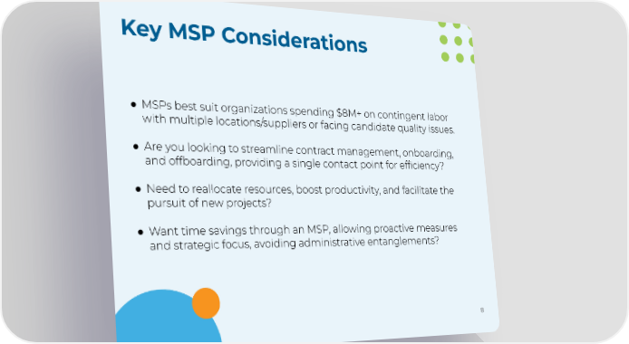 Key MSP Considerations ● MSPs best suit organizations spending $8M+ on contingent labor with multiple locations/suppliers or facing candidate quality issues. ● Are you looking to streamline contract management, onboarding, and offboarding, providing a single contact point for efficiency? ● Need to reallocate resources, boost productivity, and facilitate the pursuit of new projects? ● Want time savings through an MSP, allowing proactive measures and strategic focus, avoiding administrative entanglements? 8
