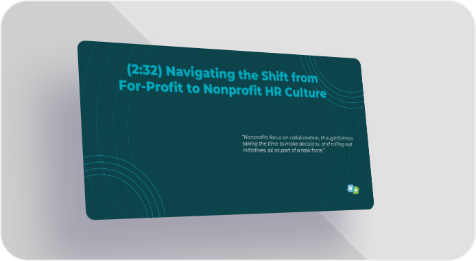 (2:32) Navigating the Shift from For-Profit to Nonprofit HR Culture “Nonprofits focus on collaboration, thoughtfulness, taking the time to make decisions, and rolling out initiatives, all as part of a task force.”