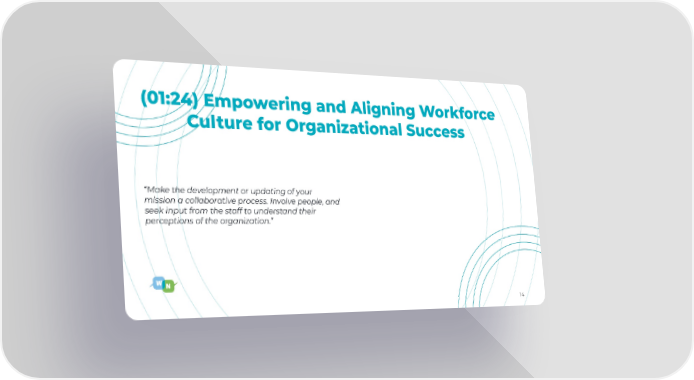 (01:24) Empowering and Aligning Workforce Culture for Organizational Success “Make the development or updating of your mission a collaborative process. Involve people, and seek input from the staff to understand their perceptions of the organization.” 14
