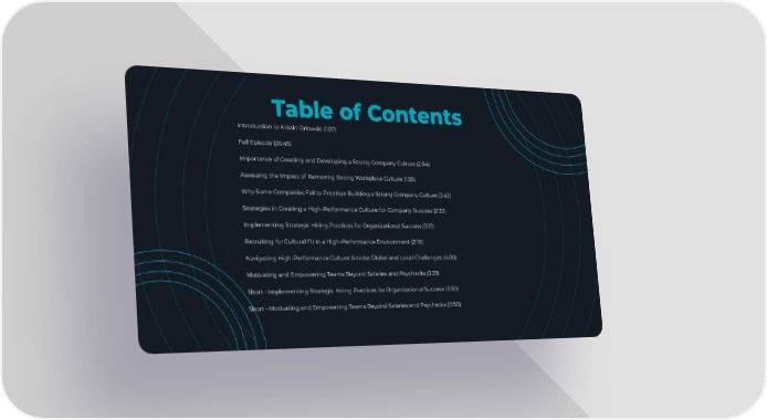 Table of Contents Introduction to Kristin Orlowski (1:07) Full Episode (26:45) Importance of Creating and Developing a Strong Company Culture (2:54) Assessing the Impact of Removing Strong Workplace Culture (1:36) Why Some Companies Fail to Prioritize Building a Strong Company Culture (2:42) Strategies in Creating a High-Performance Culture for Company Success (2:33) Implementing Strategic Hiring Practices for Organizational Success (3:17) Recruiting for Cultural Fit in a High-Performance Environment (2:16) Navigating High-Performance Culture Amidst Global and Local Challenges (4:00) Motivating and Empowering Teams Beyond Salaries and Paychecks (3:29) Short - Implementing Strategic Hiring Practices for Organizational Success (0:50) Short - Motivating and Empowering Teams Beyond Salaries and Paychecks (0:50)