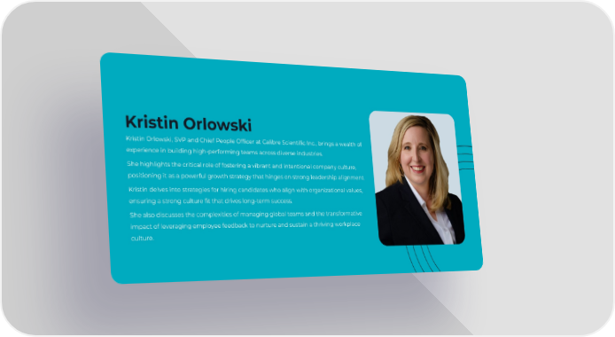 Kristin Orlowski Kristin Orlowski, SVP and Chief People Ofûcer at Calibre Scientiûc Inc., brings a wealth of experience in building high-performing teams across diverse industries. She highlights the critical role of fostering a vibrant and intentional company culture, positioning it as a powerful growth strategy that hinges on strong leadership alignment. Kristin delves into strategies for hiring candidates who align with organizational values, ensuring a strong culture ût that drives long-term success. She also discusses the complexities of managing global teams and the transformative impact of leveraging employee feedback to nurture and sustain a thriving workplace culture.