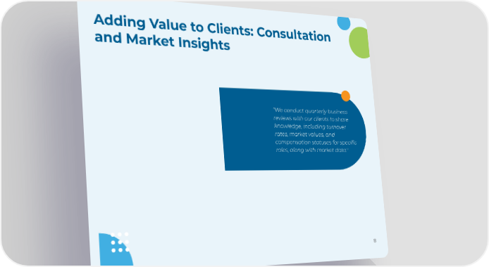 Adding Value to Clients: Consultation and Market Insights "We conduct quarterly business reviews with our clients to share knowledge, including turnover rates, market values, and compensation statuses for speciļ¬c roles, along with market data." 8 8