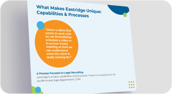 What Makes Eastridge Unique: Capabilities & Processes “When a client first wants to work with us, we immediately schedule a video or in-person intake meeting so that we can understand what the client is really looking for.” A Process Focused on Legal Recruiting Eastridge’s unique capabilities and processes make it a trusted partner for law firms and legal departments. (2:41)