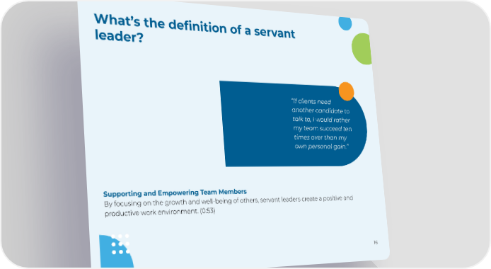 What’s the definition of a servant leader? “If clients need another candidate to talk to, I would rather my team succeed ten times over than my own personal gain.” Supporting and Empowering Team Members By focusing on the growth and well-being of others, servant leaders create a positive and productive work environment. (0:53) 16 16