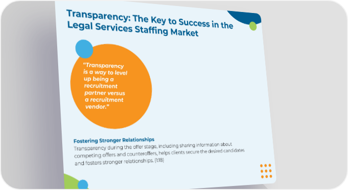 Transparency: The Key to Success in the Legal Services Staffing Market “Transparency is a way to level up being a recruitment partner versus a recruitment vendor.” Fostering Stronger Relationships Transparency during the offer stage, including sharing information about competing offers and counteroffers, helps clients secure the desired candidates and fosters stronger relationships. (1:18)