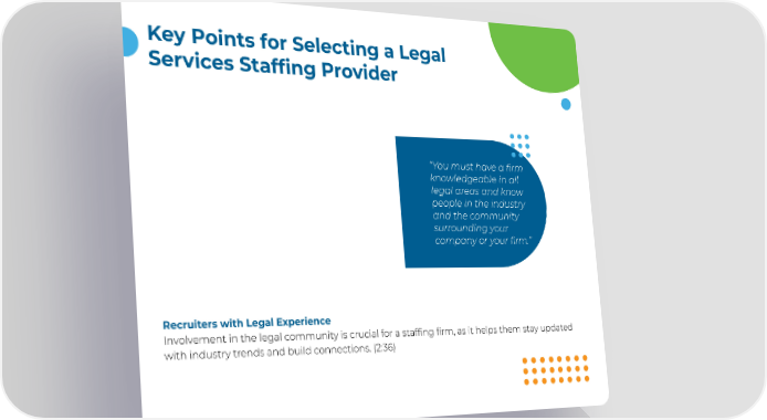 12 Key Points for Selecting a Legal Services Staffing Provider “You must have a firm knowledgeable in all legal areas and know people in the industry and the community surrounding your company or your firm.” Recruiters with Legal Experience Involvement in the legal community is crucial for a staffing firm, as it helps them stay updated with industry trends and build connections. (2:36)