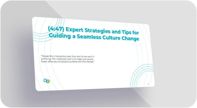 14 (4:47) Expert Strategies and Tips for Guiding a Seamless Culture Change “People fear change because they don't know what it will bring. The important part is to make sure people know what you're trying to achieve with the change.”
