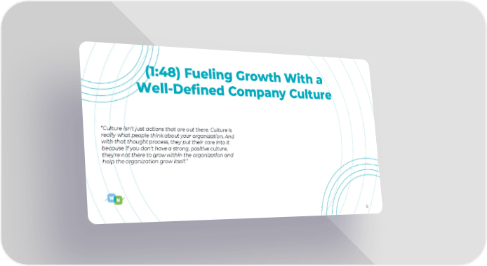 8 (1:48) Fueling Growth With a Well-Defined Company Culture “Culture isn't just actions that are out there. Culture is really what people think about your organization. And with that thought process, they put their care into it because if you don't have a strong, positive culture, they're not there to grow within the organization and help the organization grow itself.”