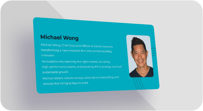 Michael Wong Michael Wong, Chief Executive Officer at Genea, recounts transforming a near-insolvent firm into a smart-building innovator. He explains why selecting the right market, recruiting high-performance teams, and elevating HR to strategy level fuel sustainable growth. Michael details culture surveys, prescriptive onboarding, and remote-first hiring as keys to scale.