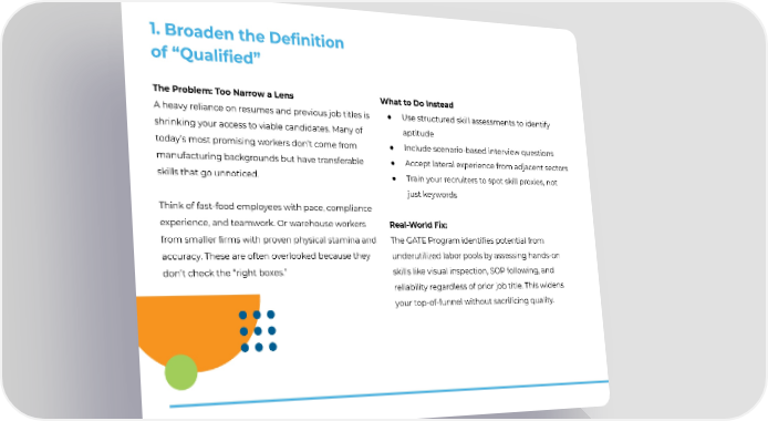1. Broaden the Definition of “Qualified” The Problem: Too Narrow a Lens A heavy reliance on resumes and previous job titles is shrinking your access to viable candidates. Many of today’s most promising workers don’t come from manufacturing backgrounds but have transferable skills that go unnoticed. Think of fast-food employees with pace, compliance experience, and teamwork. Or warehouse workers from smaller firms with proven physical stamina and accuracy. These are often overlooked because they don’t check the “right boxes.” What to Do Instead ● Use structured skill assessments to identify aptitude ● Include scenario-based interview questions ● Accept lateral experience from adjacent sectors ● Train your recruiters to spot skill proxies, not just keywords Real-World Fix: The GATE Program identifies potential from underutilized labor pools by assessing hands-on skills like visual inspection, SOP following, and reliability regardless of prior job title. This widens your top-of-funnel without sacrificing quality.