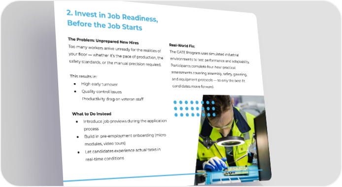 2. Invest in Job Readiness, Before the Job Starts The Problem: Unprepared New Hires Too many workers arrive unready for the realities of your floor — whether it’s the pace of production, the safety standards, or the manual precision required. This results in: ● High early turnover ● Quality control issues Productivity drag on veteran staff What to Do Instead ● Introduce job previews during the application process ● Build in pre-employment onboarding (micro modules, video tours) ● Let candidates experience actual tasks in real-time conditions Real-World Fix: The GATE Program uses simulated industrial environments to test performance and adaptability. Participants complete four-hour practical assessments covering assembly, safety, gowning, and equipment protocols — so only the best-fit candidates move forward.