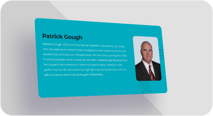 Patrick Gough Patrick Gough, CEO and Founder at Poseidon Consulting LLC, dives into his extensive Marine Corps background and explains why formal leadership curricula are indispensable. He describes glaring shortfalls in the corporate world, where tenure often replaces real development. He argues that investing in training fosters higher retention and performance. He concludes by highlighting why leadership can’t be left to chance and must be taught deliberately.