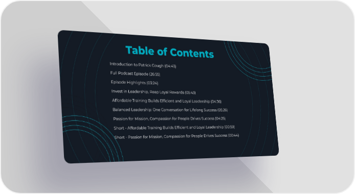Introduction to Patrick Gough (04:43) Full Podcast Episode (26:55) Episode Highlights (03:24) Invest in Leadership, Reap Loyal Rewards (05:43) Affordable Training Builds Efficient and Loyal Leadership (04:36) Balanced Leadership: One Conversation for Lifelong Success (05:26) Passion for Mission, Compassion for People Drives Success (04:25) Short - Affordable Training Builds Efficient and Loyal Leadership (00:59) Short - Passion for Mission, Compassion for People Drives Success (00:44) Table of Contents