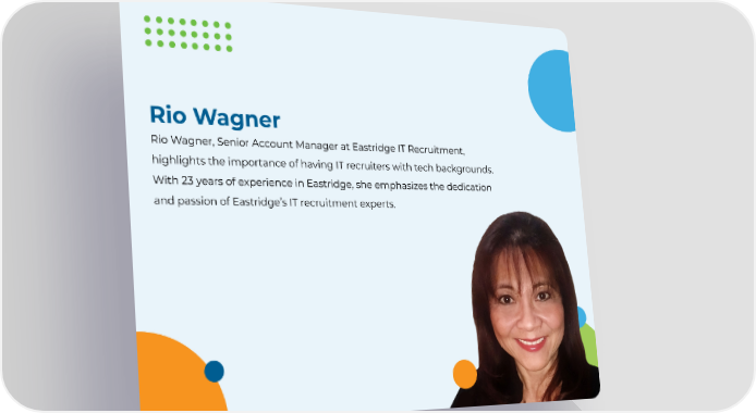 Rio Wagner Rio Wagner, Senior Account Manager at Eastridge IT Recruitment, highlights the importance of having IT recruiters with tech backgrounds. With 23 years of experience in Eastridge, she emphasizes the dedication and passion of Eastridge’s IT recruitment experts.