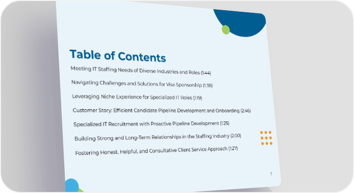 Table of Contents Meeting IT Staffing Needs of Diverse Industries and Roles (1:44) Navigating Challenges and Solutions for Visa Sponsorship (1:38) Leveraging Niche Experience for Specialized IT Roles (1:19) Customer Story: Efficient Candidate Pipeline Development and Onboarding (2:46) Specialized IT Recruitment with Proactive Pipeline Development (1:25) Building Strong and Long-Term Relationships in the Staffing Industry (2:00) Fostering Honest, Helpful, and Consultative Client Service Approach (1:27) 3
