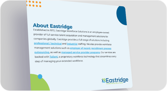 About Eastridge Established in 1972, Eastridge Workforce Solutions is an employee-owned provider of full-service talent acquisition and management solutions for companies globally. Eastridge provides a full range of solutions including professional / technical and industrial staffing. We also provide workforce management solutions such as employer of record, recruitment process outsourcing, as well as managed service provider programs. Our services are backed with Talient, a proprietary workforce technology that streamlines every step of managing your extended workforce.